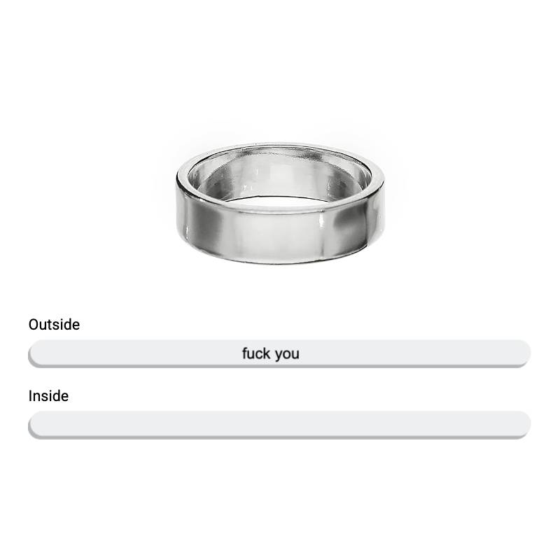Base product: 6mm Silver Band (7US) Engravings: – “fuck you”, Font: Arial, size: 22, Charm Name: 6mm Silver Band